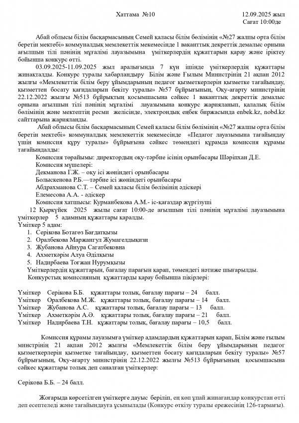 Ағылшын тілі мұғалімі лауазымына конкурс нәтижесі » "№ 27 жалпы орта білім беретін мектебі" КММ, Семей қаласы, Абай облысы.