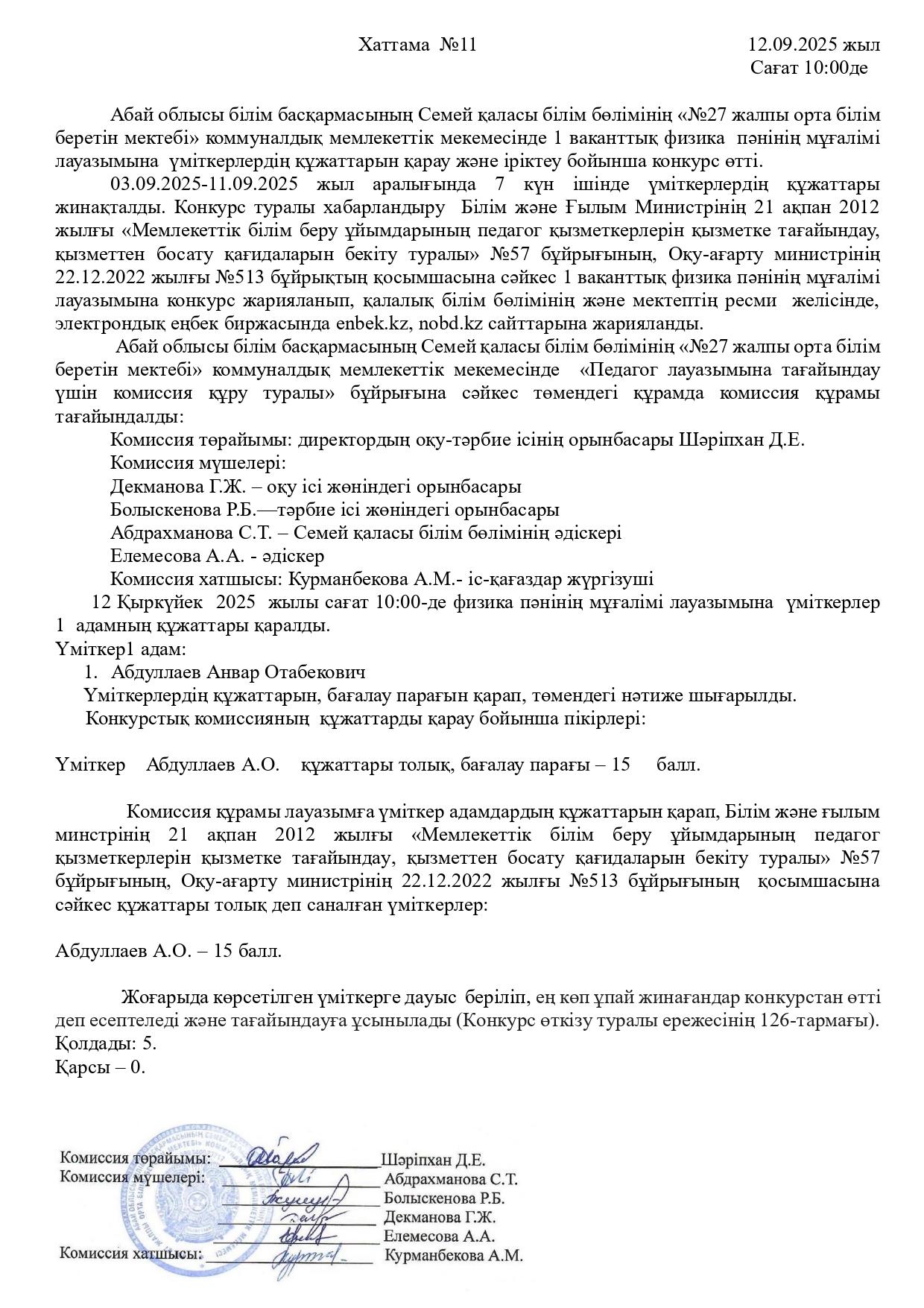 Физика пәнінің мұғалімі лауазымына конкурс нәтижесі » "№ 27 жалпы орта білім беретін мектебі" КММ, Семей қаласы, Абай облысы.