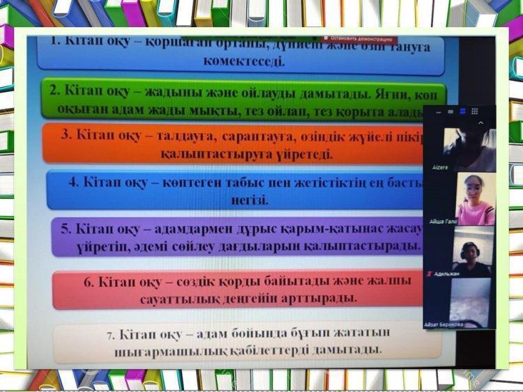 "Кітап оқуды тоқтатқан адам, ойлауды да тоқтатады" тәрбие сағаты. 7 "В" сыныбы. Мақсаты: білімнің кітап арқылы берілетінін ұғындыру, кітаптың адам өміріндегі маңызын, ғылым мен білімінің пайдасы жөнінде түсіндіру. Оқушылардың кітапқа деген қызығушылығын арттыру. Сынып жетекшісі: Советқанова М. С.
