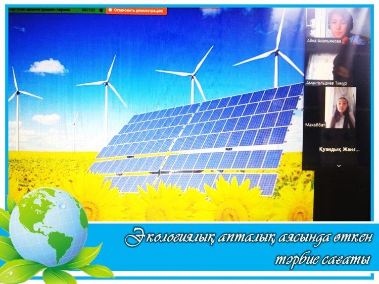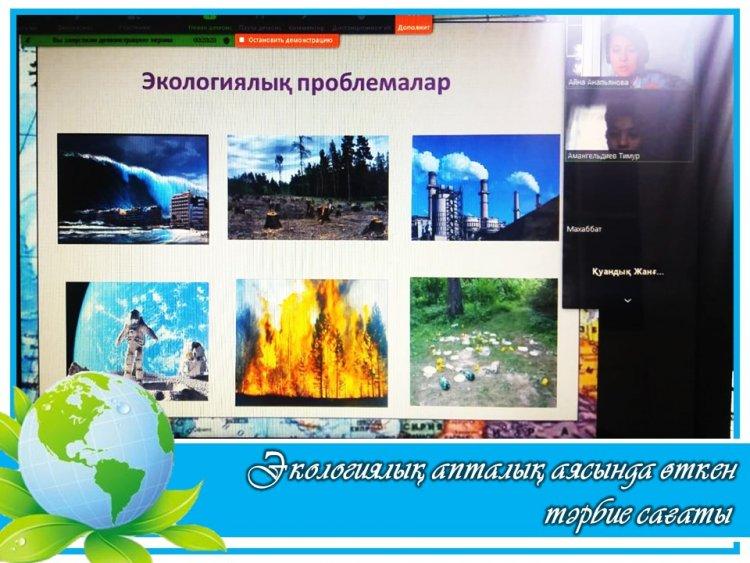 10 сынып оқушыларымен "Жер – біздің үйіміз" атты тәрбие сағаты өтті. Мақсаты: Оқушылардың қоршаған ортаға деген махаббат құндылықтары жайлы түсініктерін кеңейту; табиғатты қорғауға, жерін сүюге, мейірімділікке, ізгілікке тәрбиелеу, Табиғат - Анаға сүйіспеншілікпен қарауға жетелеу; шығармашылық қабілеттерін, жақсылық жасай білу іскерліктерін, ойлау қабілетін дамыту, өз ойын еркін жеткізе білуге дағдыландыру. Пікіралмасу арқылы оқушылар қазіргі кездегі экологиялық ахуалды талқылап, оның шешу жолдарын ұсынды.